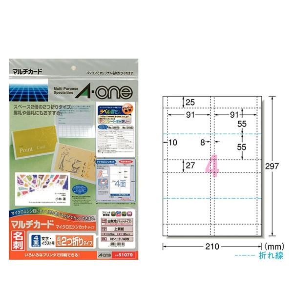 エーワン マルチカード 名刺用紙 ショップカード 2つ折り縦開き ミシン目 両面 プリンタ兼用 マット紙 白 標準 a4 4面 1袋 10シート入 51079