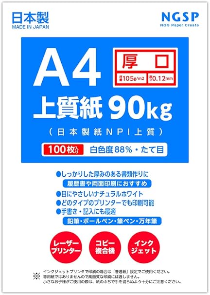 厚口 上質紙 90キロ 国産 日本製紙 npi上質 a4 100枚