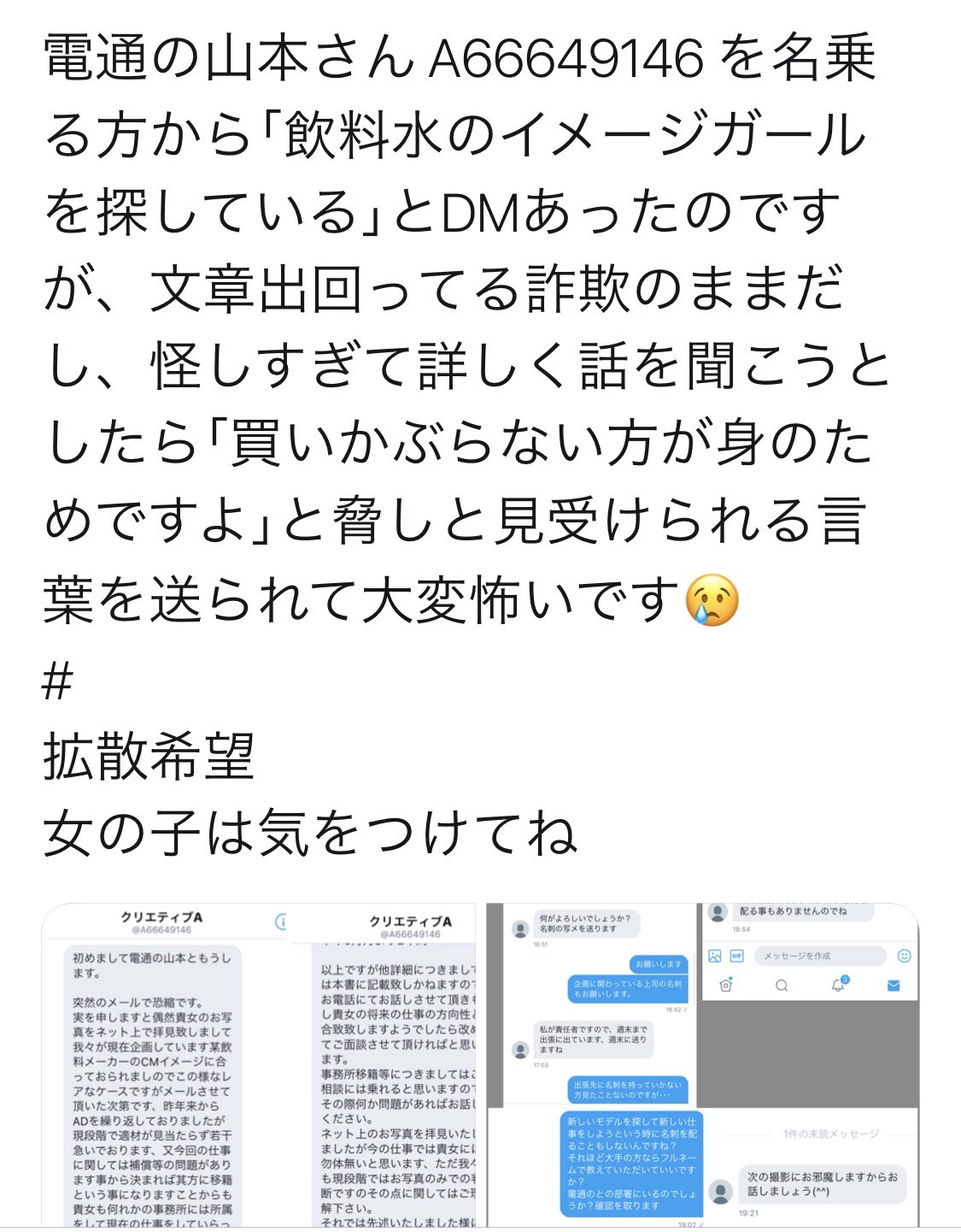 桜野 友佳 mc モデル on twitter ニセ電通さん 石川さんから山本さんになってる a66649146 何がしたいんだろうなー 女の子の連絡先知りたいのかなー 電通さんがキャスティング会社を通さない直接の声掛けは有り得ないので しかもメールの文面
