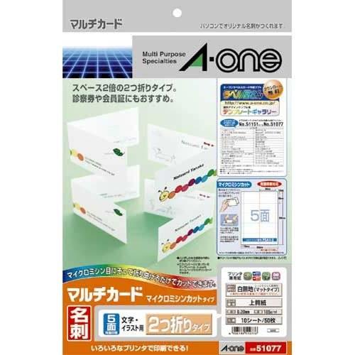 エーワン マルチカード 名刺用紙 ショップカード 2つ折り横開き ミシン目 両面 プリンタ兼用 マット紙 白 標準 a4 5面 1袋 10シート入 51077