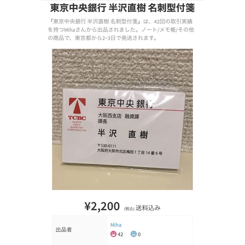 全新日版絕版正品 半澤直樹名片型便利貼